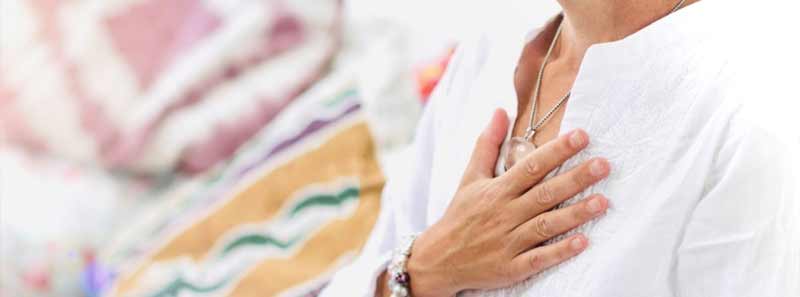 Commencez par mettre légèrement vos mains sur votre propre gorge. Cela peut provoquer une légère panique chez certaines personnes qui ont subi un traumatisme - si c’est le cas, placez plutôt vos mains sur votre clavicule en dessous. Restez ici jusqu’à ce que les perturbations énergétiques cessent. N’oubliez pas de passer vos mains si la sensation est trop forte. La position suivante est UNIQUEMENT faite pour l’auto-guérison autour du chakra du cœur. Le chakra du cœur est extrêmement sensible... donc si quelqu’un vient vous demander de l’aide pour guérir son chakra du cœur, veuillez refuser. Il est de toute façon préférable de guérir en utilisant les principes d’auto-guérison.